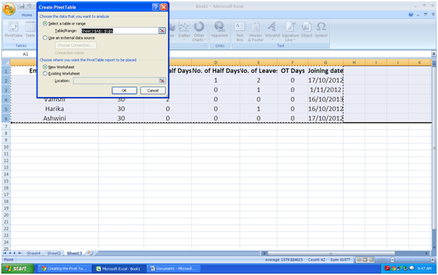 - Click on Pivot Table in the list to open the Create Pivot Table dialog box.