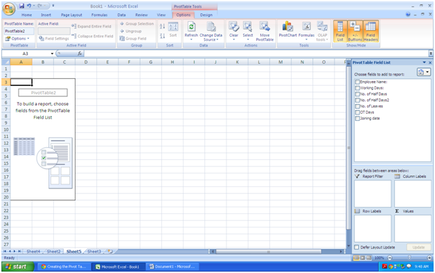 A blank pivot table should appear on the new worksheet as shown in the above image.