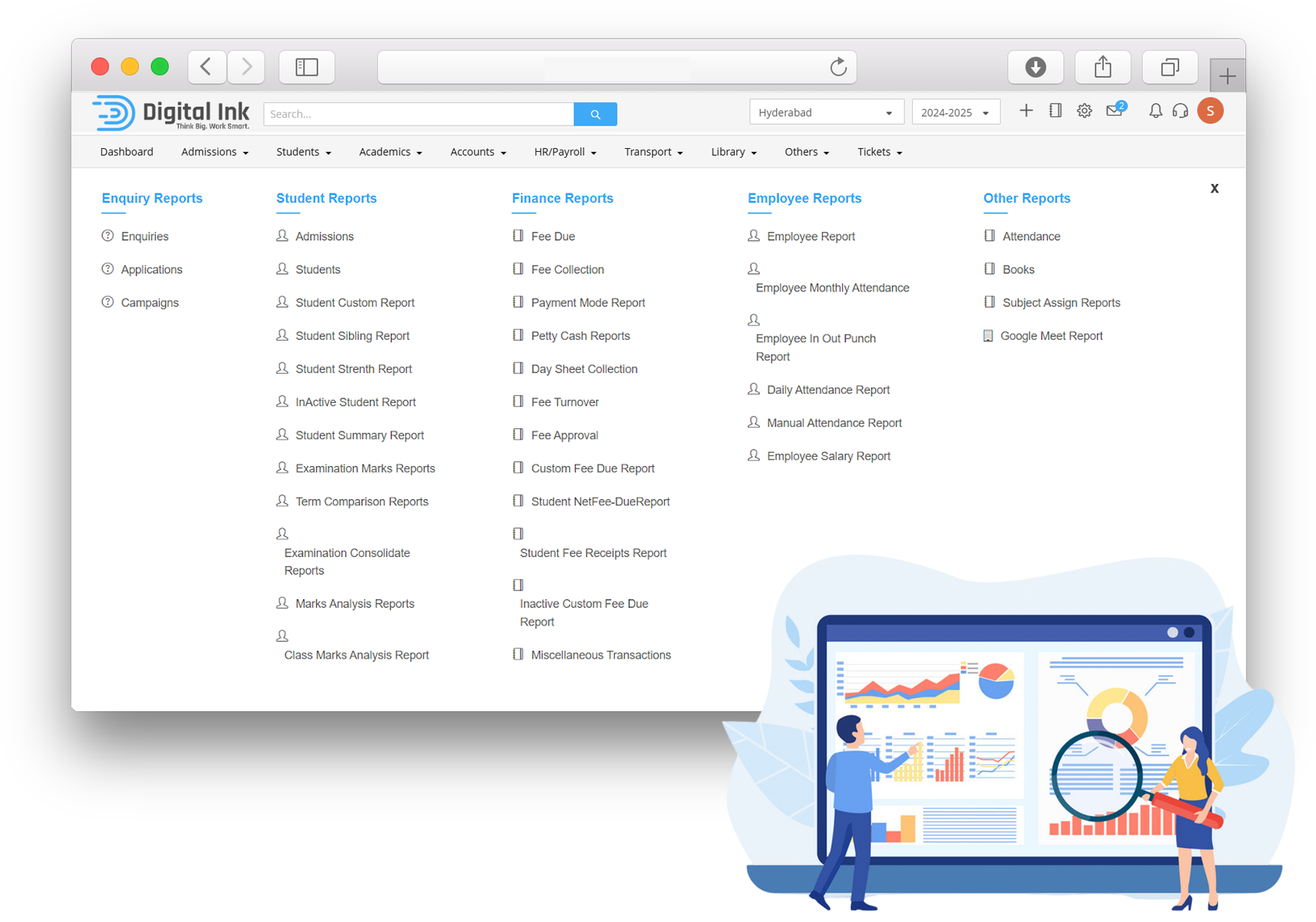Gain a comprehensive understanding of school performance, parent feedback, best performing students, best class, best faculty, system and infrastructure improvements, syllabus and teaching methodology improvements. Generate and analyze reports and view them in beautiful charts, pivot tables and also in tabular forms for quick reference and improvement of processes.