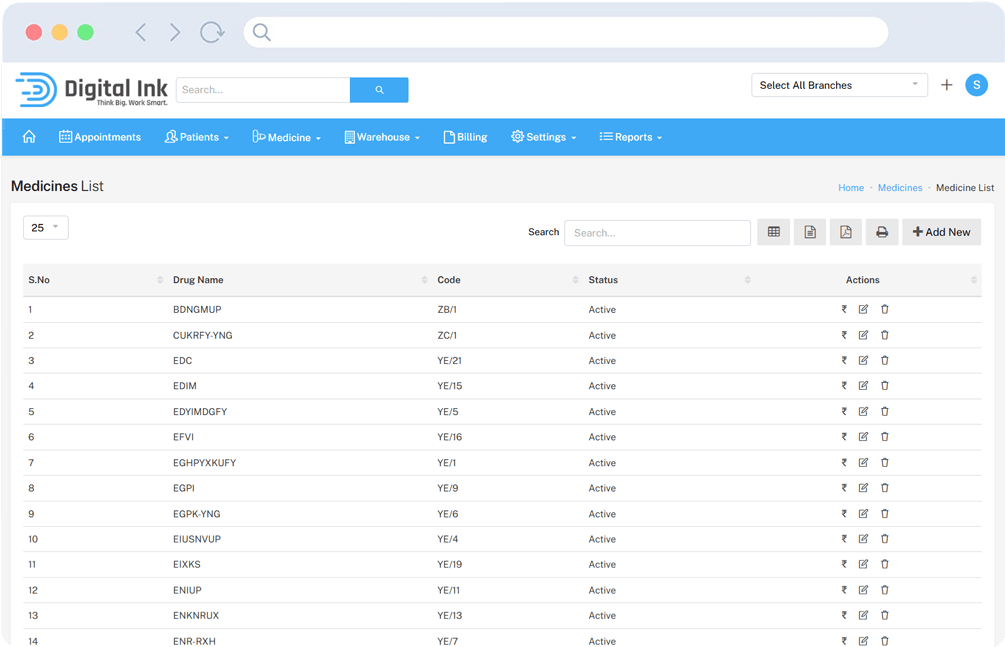 Each medicine entry includes its name, code, status, and pricing details, ensuring transparency in inventory and billing.