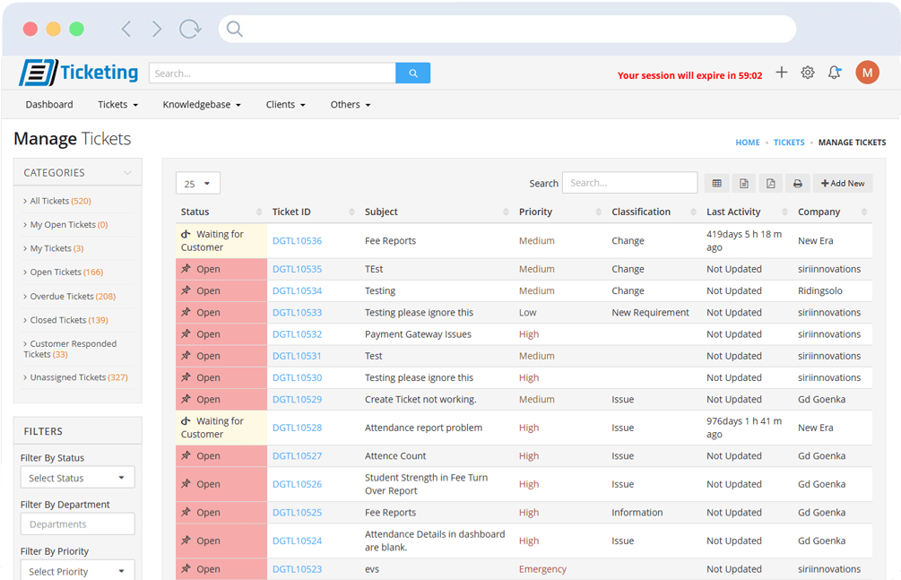 Tickets include details like subject, priority, status, classification, and timestamps for tracking.