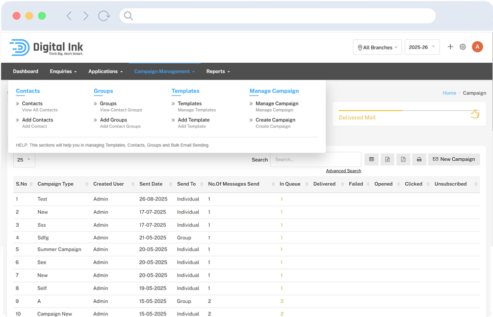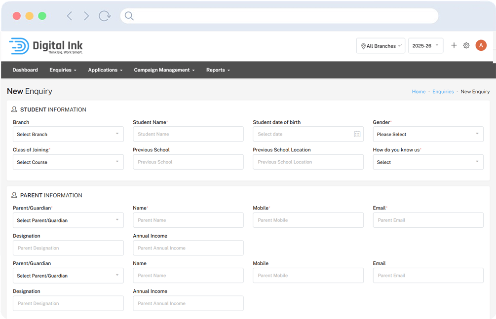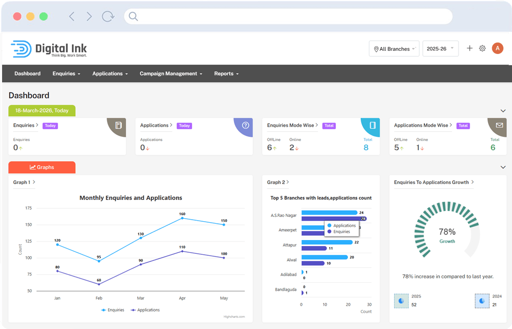 Digital Ink Edu Leads helps institutions capture enquiries, automate follow-ups, manage applications, and track the complete admission journey from one powerful dashboard.