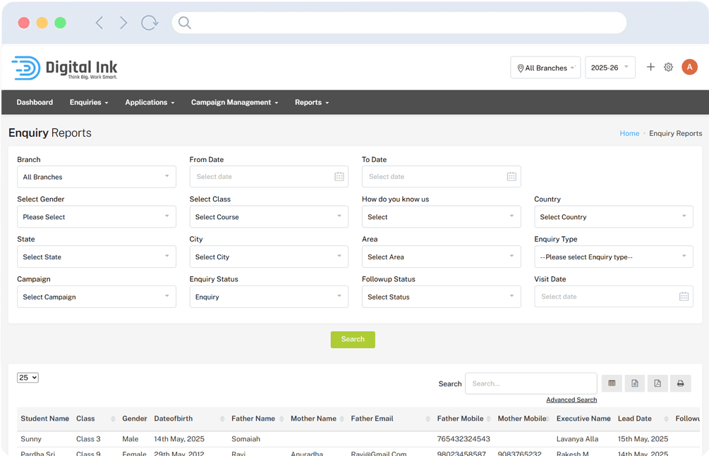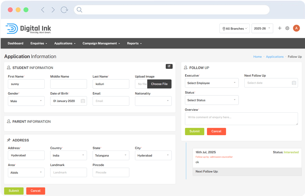 Executives can assign tasks, update statuses, and maintain a timeline of interactions. Advanced filters and search options help prioritize follow ups across branches and academic years.