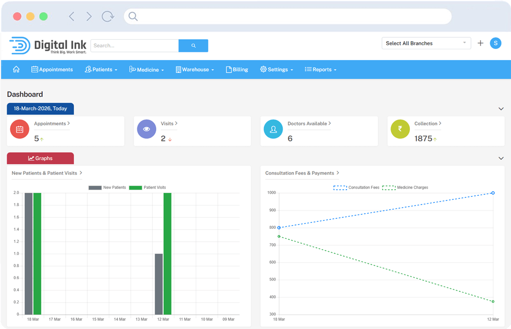 Graphs highlight trends in new patients, patient visits, consultation fees, and medicine charges, making performance easy to track.