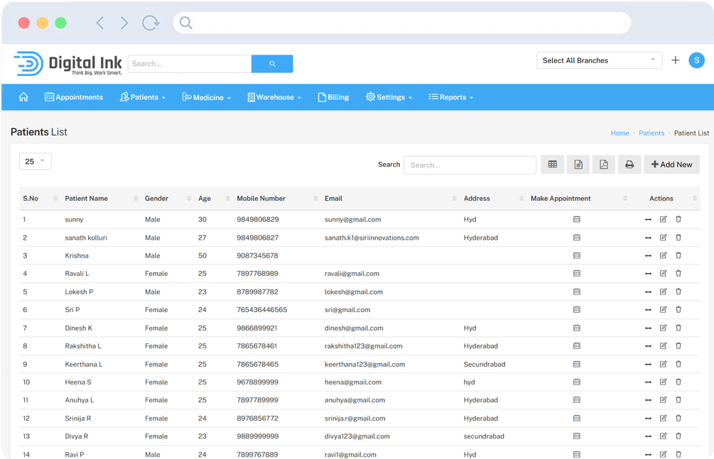 Patients are managed through a centralized list that displays essential details like name, age, gender, contact information, and address.