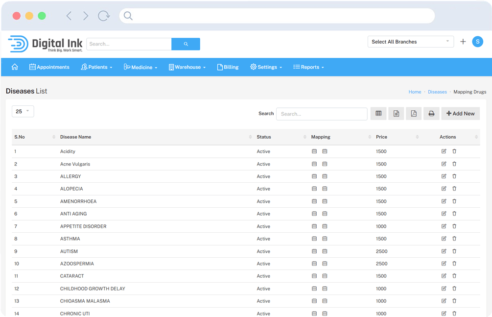 Each entry includes the disease name, status, price, and mapping options, making it easy to manage and update.