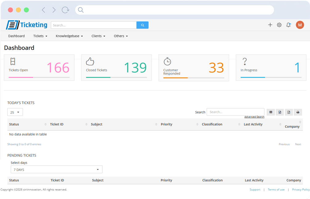The ticketing dashboard provides a real-time overview of all support requests and their current status.