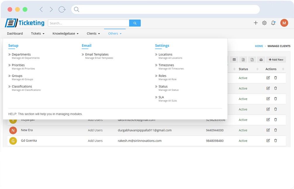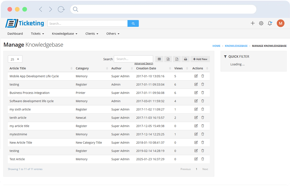 The knowledgebase module provides a centralized platform for managing support articles and documentation.